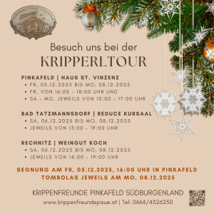 Die Krippenfreunde Pinkafeld Südburgenland haben in diesem Advent einiges vor und planen eine Kripperltour mit 3 gleichzeitig stattfindenen Ausstellungen in Pinkafeld, Bad Tatzmannsdorf und Rechnitz.